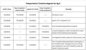 Eg.4 : Now consider that one hour on Earth is equal to one second in X space/time zone. Time runs slow there. Now the person on earth after 2hrs teleports to that X space/time zone. He will see that his clock ticks 2hr as usual, but clocks there is ticking 2sec. Now he teleports back to earth at 4sec of that place and 2hr3sec of his clock. He will see that his clock ticks 2hr3sec, but earth clock moves 4hrs. Here again though the time at the X space/time was running really fast he could not go to future on earth.