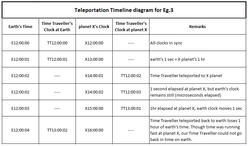 Eg.4 : Now consider that one hour on Earth is equal to one second in X space/time zone. Time runs slow there. Now the person on earth after 2hrs teleports to that X space/time zone. He will see that his clock ticks 2hr as usual, but clocks there is ticking 2sec. Now he teleports back to earth at 4sec of that place and 2hr3sec of his clock. He will see that his clock ticks 2hr3sec, but earth clock moves 4hrs. Here again though the time at the X space/time was running really fast he could not go to future on earth.