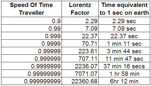 In the above table, we can see that when the speed of time traveler is 0.9 times the speed of light his clock will run 2.3 times slow than that on earth, i.e earth’s 1sec = time traveler’s 2.3sec. Similarly we can keep on adding 9 at the end of that number to increase precision and actually calculate how slow the time traveler’s clock will run with respect to time on earth.